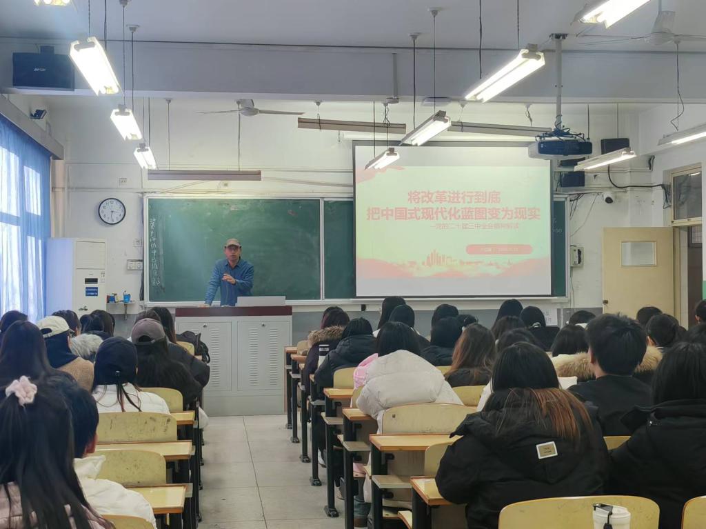 12月3日下午,太阳成集团tyc151cc在2103教室举办了一场主题为“将改革进行到底,把中国式现代化蓝图变为现实——党的二十届三中全会精神解读”的思政报告会。本次报告会由公司党总支副书记刘凯主持,特邀华北理工大学齐立强教授主讲。太阳成集团tyc151cc全体员工党员和部分入党积极分子共110人参加了此次报告会。