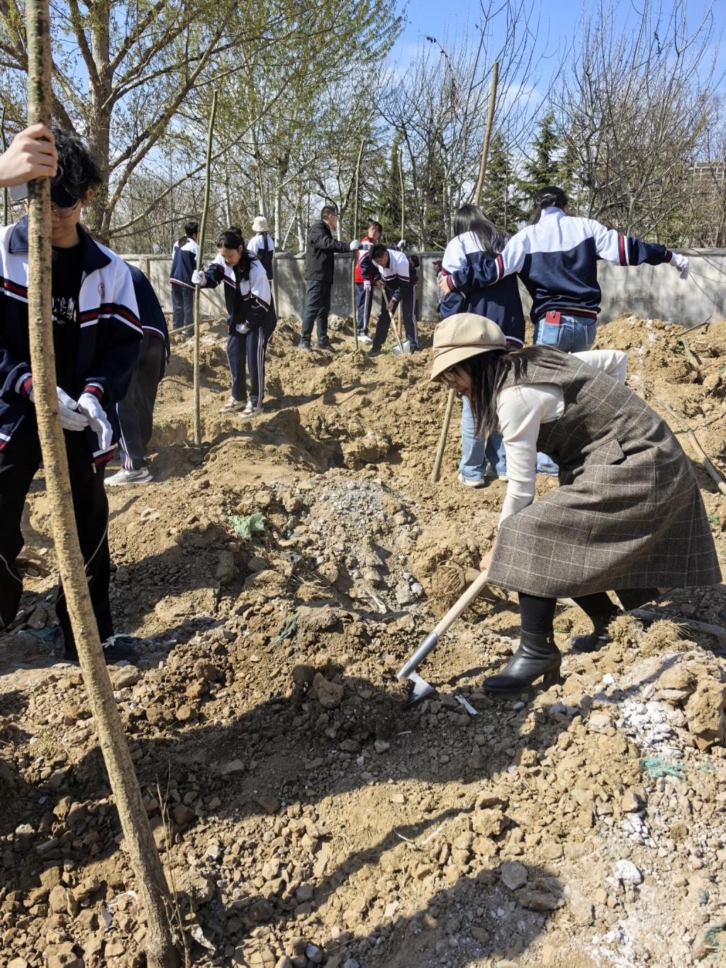 员工们热情高涨,分组协作,干劲十足,有的挥动铁锹奋力填土,有的小心翼翼扶正树苗,有的来回奔波提水浇灌,各个环节衔接有序。