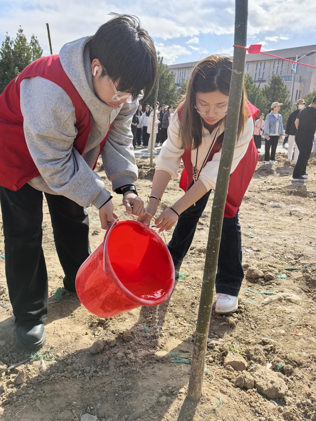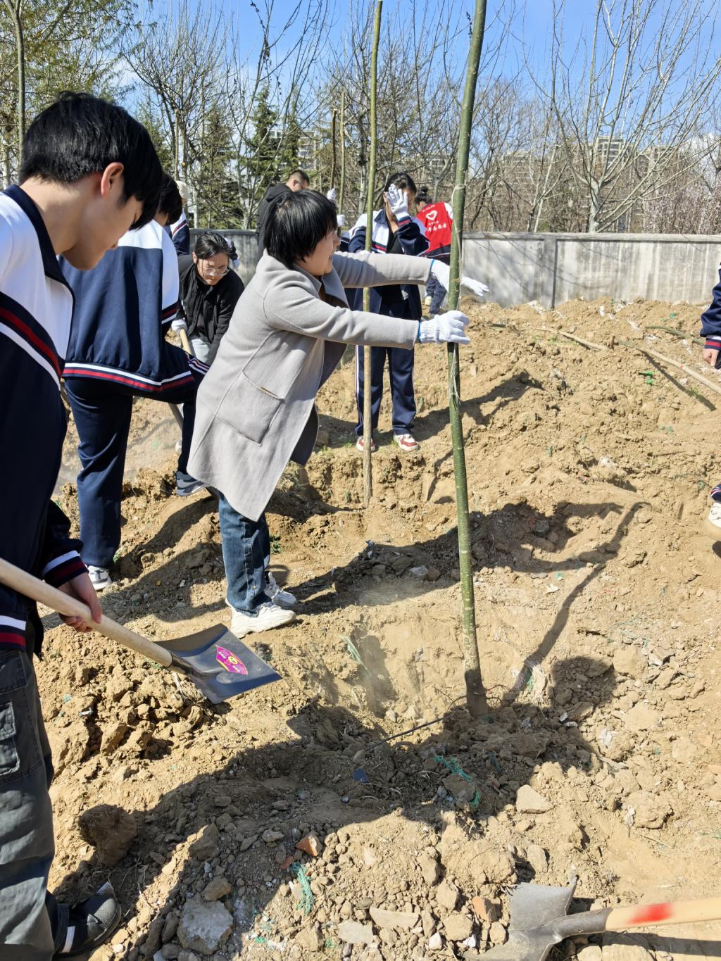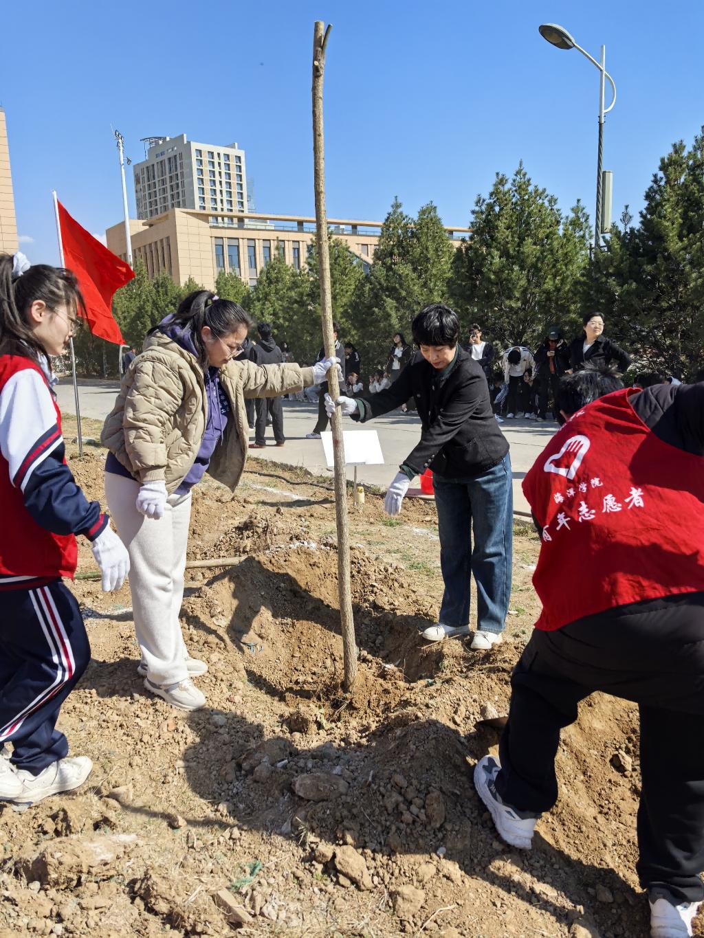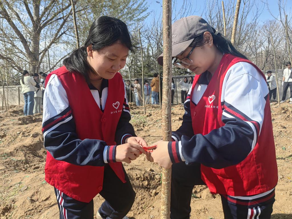 在师生党员们齐心协力的努力下,25株新树苗在校园里“扎根落户”,错落有致、迎风挺立,展现出勃勃生机。同学们还将自己对未来的寄语系在新树苗上,为这片绿色增添了一份独特的人文关怀。