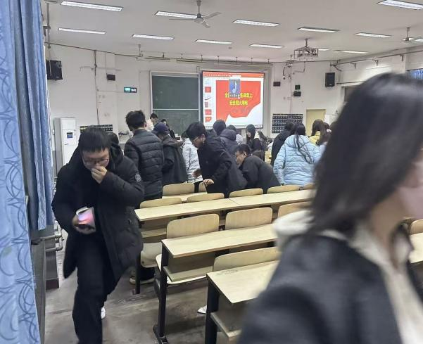 随后,应急逃生演练正式开始。随着警报响起,同学们迅速用湿毛巾捂住口鼻,弯腰低姿沿预定路线快速、有序撤离至安全区域,整个过程紧张规范、组织有序。